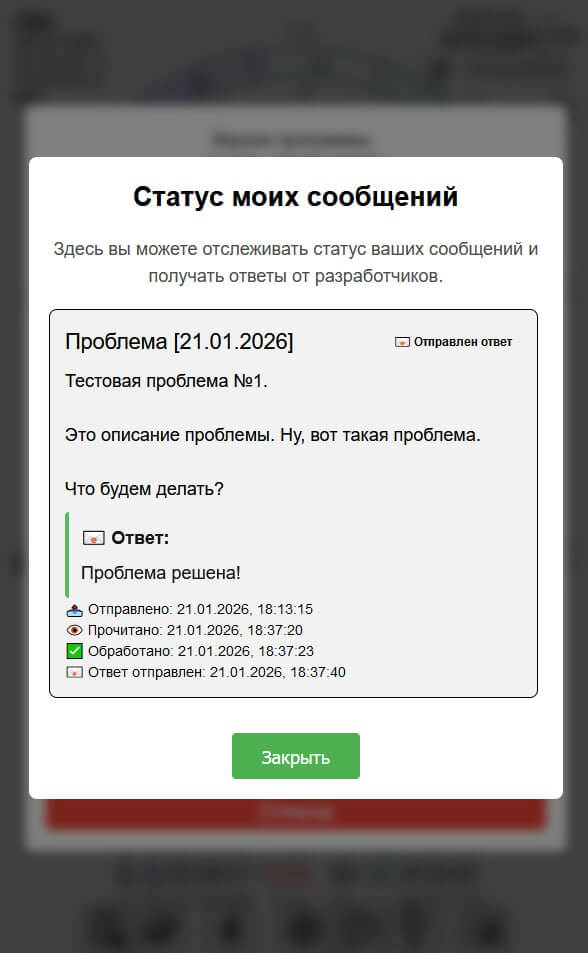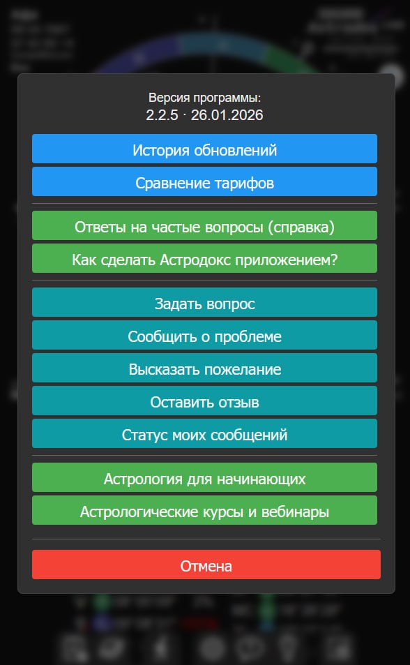 — возможность отправить вопрос по программе, отзыв, предложение или описание проблемы прямо из Астродокс, а также посмотреть историю своих сообщений и ответов на них там же;
