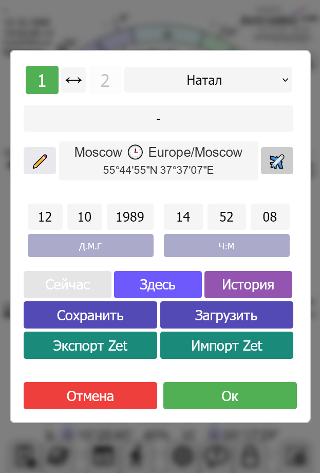 В меню нажимаем самую первую кнопку. В открывшемся окошке вводим дату, время и место рождения, нажимаем ОК. Карта сразу отобразится.
